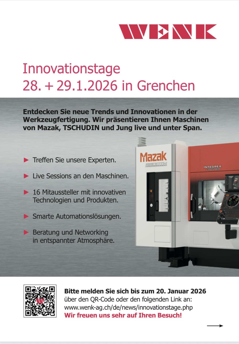 Hinweis: Vom 27. - 29. Januar 2026 finden die Innovationstage der Firma WENK AG in Grenchen statt. Im Einsatz steht auch die von uns gelieferte Automation, System Palettenlader. Als Mitaussteller zeigen wir zusätzlich unser gesamtes Spannmittel-Sortiment.